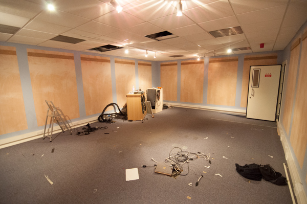 Here's a photographic update of the work done so far in Studio 3. This includes stripping out the existing floor and ceiling, stiffening the internal surfaces of the room, building a wooden frame for the acoustic treatment, fitting acoustic absorption, changing the airflow routing, putting in first-fix electrical cabling and fittings, fitting a wooden floor, fitting the wooden front wall, and fitting the rack and desk. Not much more to go now!