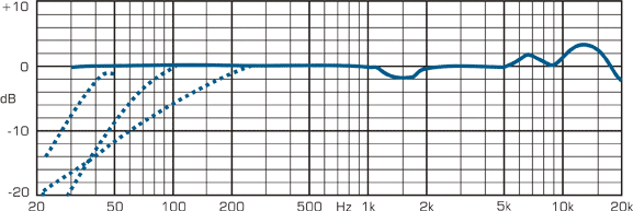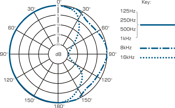 Also, due to the fact that it uses a large diaphragm, the directivity deviates at high frequencies. For instance, when set to an omnidirectional pickup pattern the directivity is almost figure-of-8 at high frequencies, as shown below.