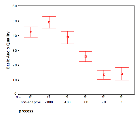 In order to answer these questions, a series of listening tests was carried out. The first listening test aimed to compare the global audio quality degradation, in term of Basic Audio Quality (BAQ), caused by non-adaptive KLT and adaptive-KLT-based HBL. For adaptive KLT, the time window length varied from 2ms to 2000ms. The results showed that: for the adaptive KLT, when the adaptation rate increases, the BAQ score tends to decrease. The adaptive KLT processing resulted in better audio quality compared with non-adaptive KLT, see Figure 2.