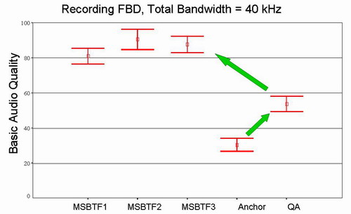 The MSBTF hierarchical encoding of surround sound was introduced by Gerzon, developed as a platform for psychoacoustically near-optimum transmission and conversion of surround sound ( Gerzon,1992). It is expected that this type of hierarchical representation of multichannel audio signals will provide a framework for psychoacoustically optimum bandwidth limitation. To verify the assumption, the degradations of audio quality caused by limiting the total bandwidth with different algorithms were studied with formal listening tests. A selected result is shown in the figure 1.