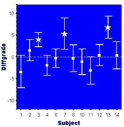 Fig. 1 Differences between basic audio quality scores obtained with picture presence and without picture for different programme material. Asterisk denotes that means are significantly different from zeroThere was no global effect of video presence on grading of audio quality, however small but statistically significant interaction between audio and visual modalities was detected for two items. Figure 1 shows differences between scores obtained during audio-visual presentation and audio-only presentation. Positive mean values show improvement of audio quality due to video interaction whereas negative values indicate deterioration of audio quality caused by video presence (zero represents no audio-visual interaction). For organ music (Classical F-B) the scores given during audio-visual presentations were lower than scores given during audio-only presentation (mean value less than zero). It was probably caused by "boring" video content (static pictures). The opposite interaction was observed for Movie F-B. In that case video presence "improved" the grading of the audio quality. It may be explained by interesting and involving content of the video presentation, which "positively" affected grading of the audio quality. In both cases video presence "shifted" the scores up to 3 % only, which shows that mentioned effect is small, however statistically significant. This observation is in line with results obtained Beerends et. al. (1999). It was also found that some of the listeners are more susceptible to video influence than others. For example, subjects No. 3, 7 and 13 had tendency to grade audio quality slightly "better" for audio-visual presentation than for audio-only one (Fig. 2). In general, obtained results showed that video presence had a small (but statistically significant) effect on audio scores.