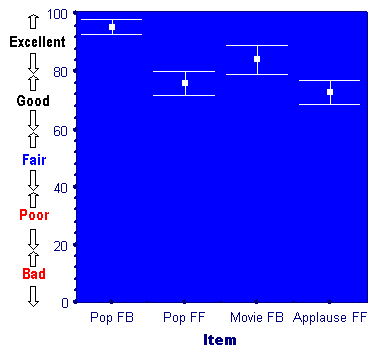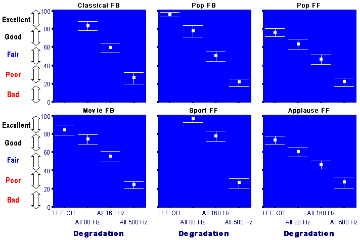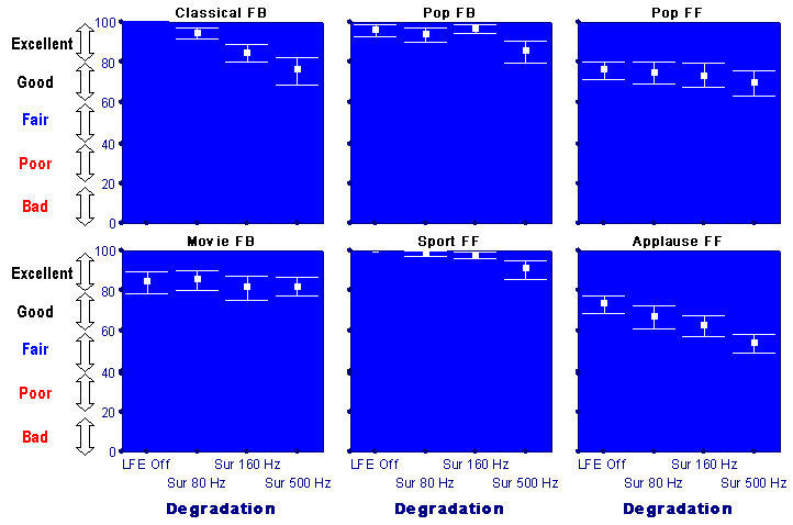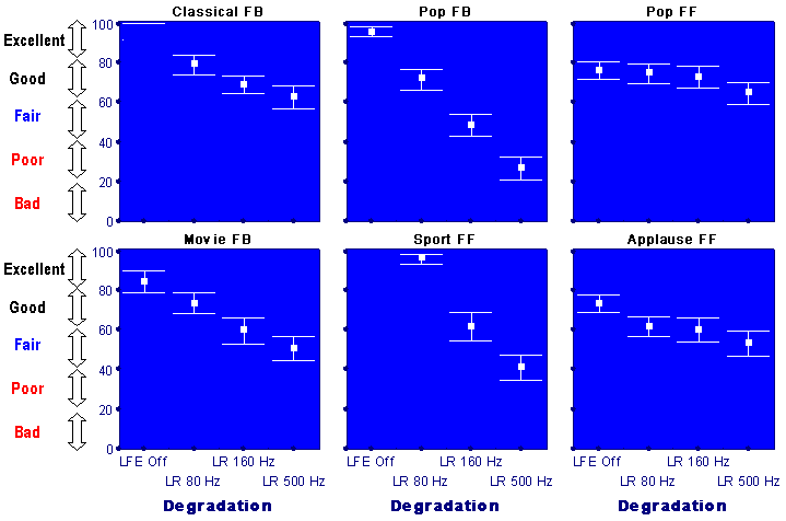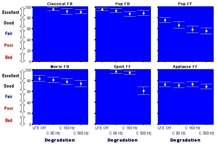 Fig. 3 Degradation of the basic audio quality caused by band-limitation of front left and right channelsIn contrast to previous cases, limitation of LF content in the centre channel had an insignificant effect on audio quality for most items. Fig. 4 shows that switching off the LFE channel had a greater effect on quality than switching off the LFE channel in conjunction with band-limitation of the centre channel. For example, for the "Applause F-F" switching off the LFE channel deteriorated the quality from "Excellent" (80-100) to "Good" (60-80). However, switching off the LFE channel and high-pass filtration of the centre channel did not cause any further degradation of quality (insignificant differences between means).